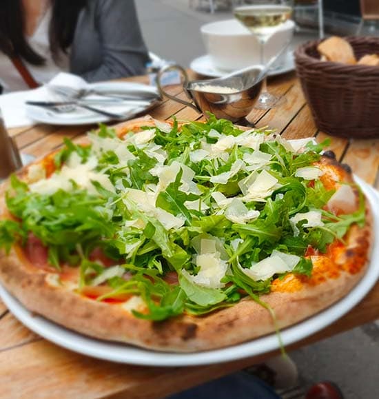 Unsere Pizzen entstehen nach traditioneller neapolitanischer Art: Der Teig fermentiert 48 Stunden lang und wird dann im Holzofen bei 450°C gebacken – außen knusprig, innen zart und bekömmlich. Wir verwenden ausschließlich San-Marzano-Tomaten, echten Büffelmozzarella und frische Zutaten, viele davon direkt aus Kampanien importiert.